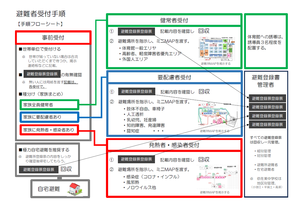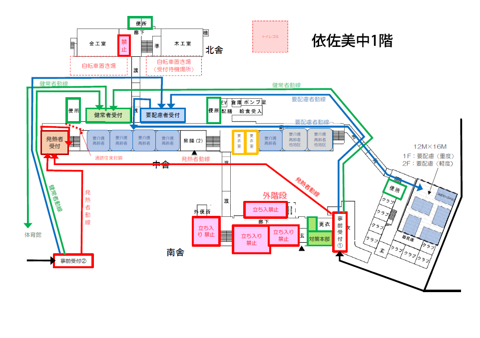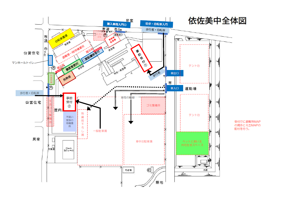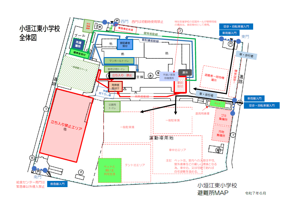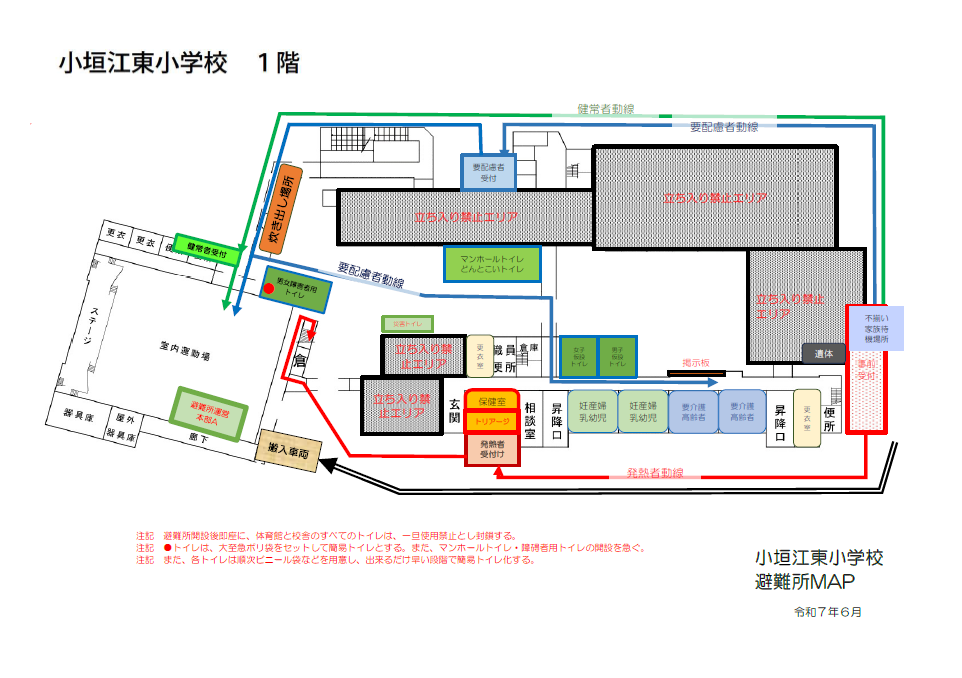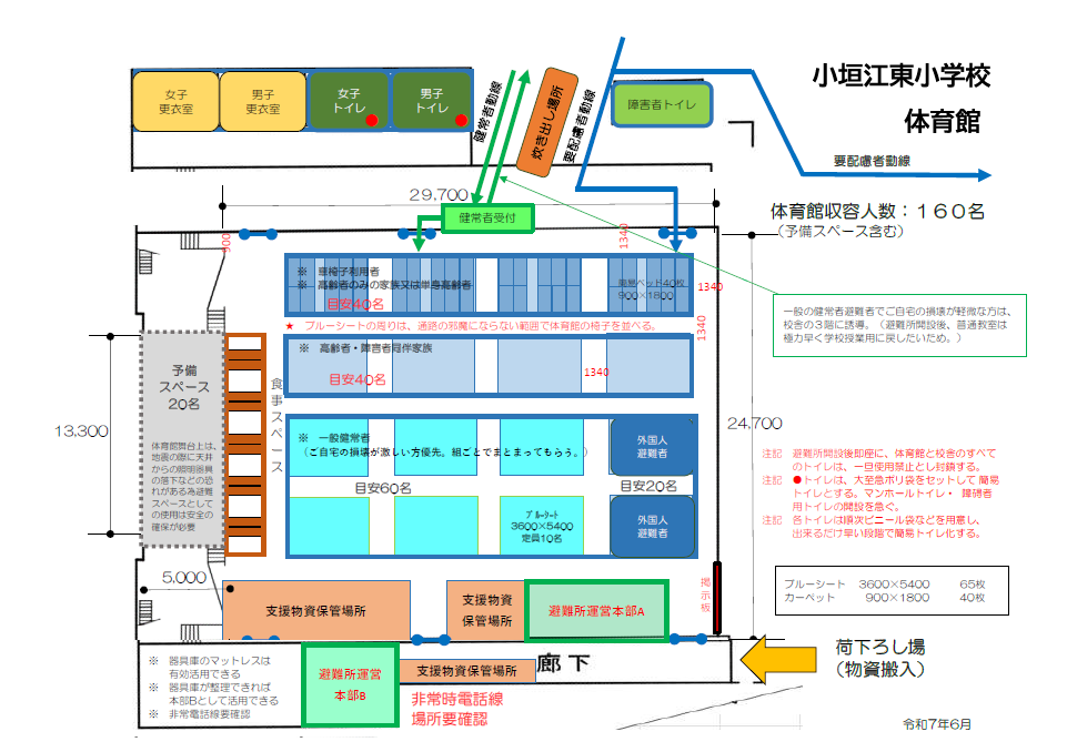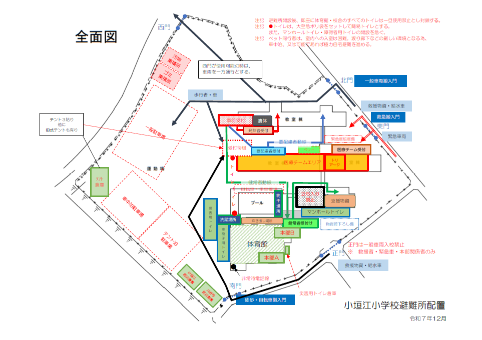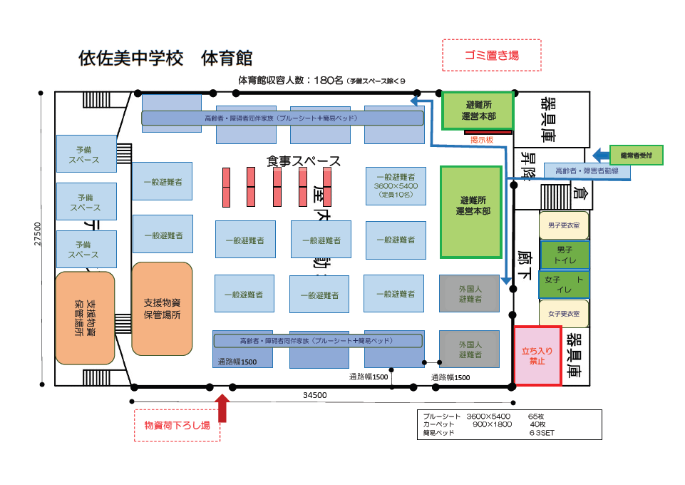 防災情報南海トラフ地震など大規模災害が発生した際の、避難所のレイアウトは以下のように想定しています。全体図/体育館/教室の3つに分かれています。