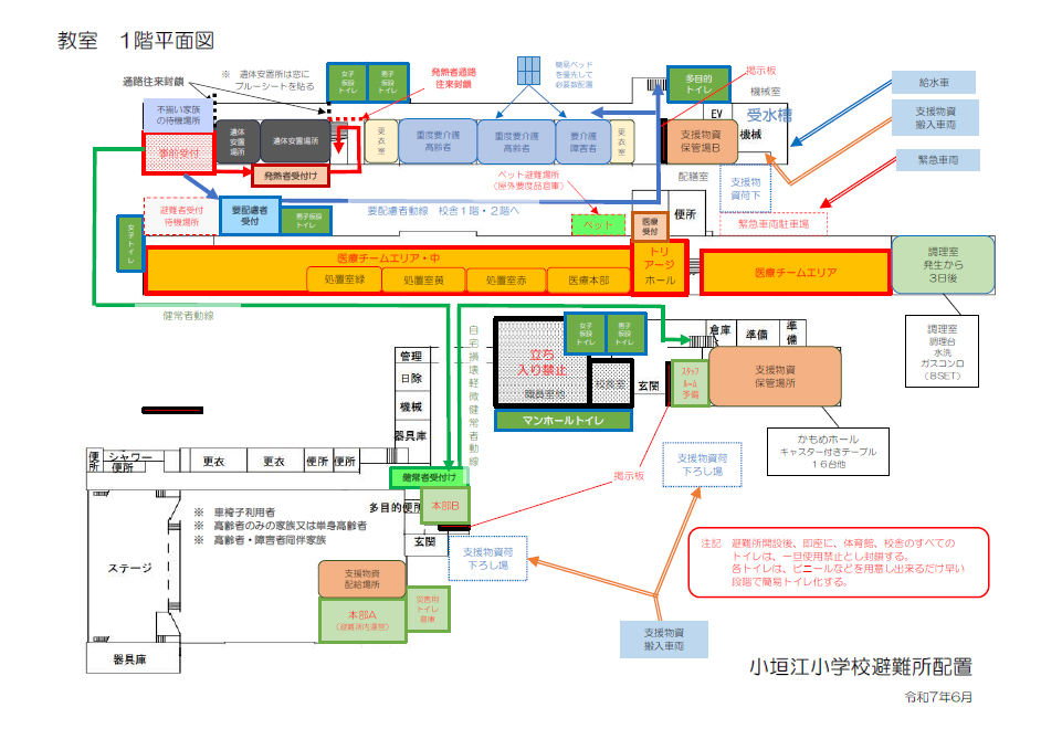 南海トラフ地震など大規模災害が発生した際の、避難所のレイアウトは以下のように想定しています。全体図/体育館/教室の3つに分かれています。