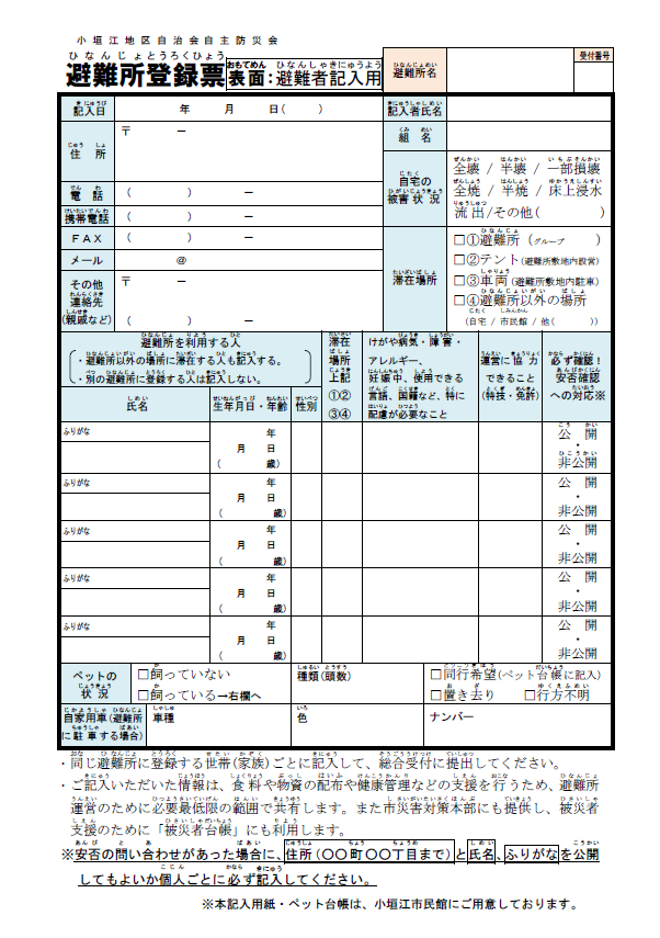 記入した避難所登録票は、玄関先や避難袋に入れておいて、