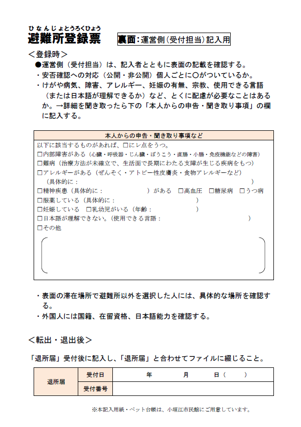 大きな災害の時は必ず開設避難所の受付に提出して下さい。