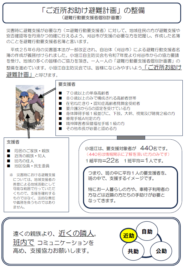 平成25年6月の災害基本法が一部改正され、自治体(刈谷市)による避難行動支援者名簿の作成が義務付けられました。小垣江自主防災会も令和7年度より刈谷市からの協力要請を受け、地域の多くの皆様のご協力を頂き、一人一人の「避難行動要支援者個別計画書」の整備を進めています。小垣江自主防災会では、皆様になじみやすいよう「ご近所お助け避難計画」と呼びます。